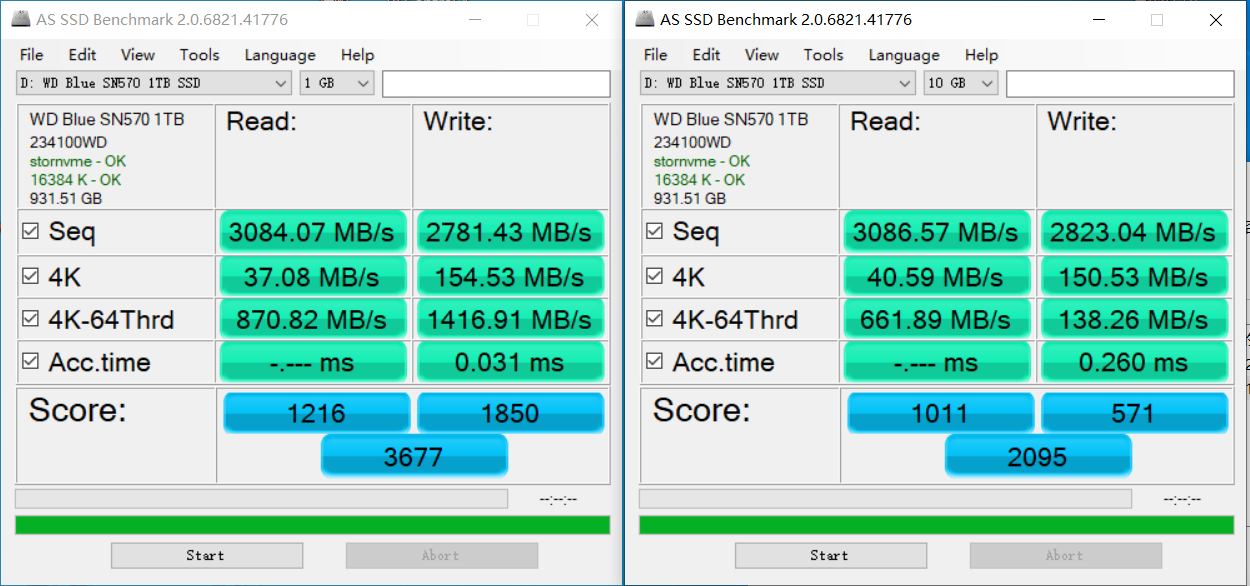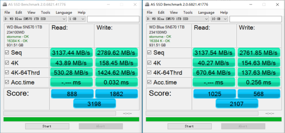 CDM部分由于软件测试机制不同,因此可以算作WD Blue SN570 1T的最佳成绩,分别测试了1G和32G两个数据量,可以看到顺序写入在32G中明显下降,只有1500MB/S左右,看来WD Blue SN570的SLC Cache容量还是较小的。