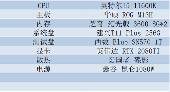 测试使用了一套十一代I5的开放式平台进行测试,详细配置如上,除温度测试外全程覆盖散热马甲,避免高温影响性能。