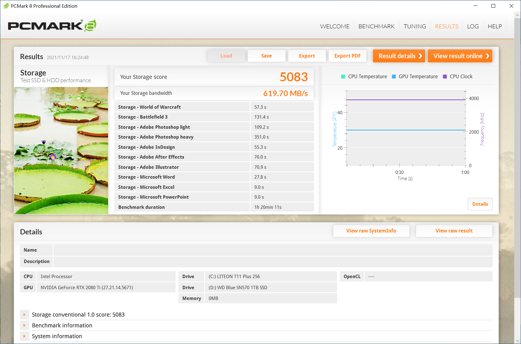 PCMARK8关于存储的测试中,得分为5083分,存储带宽为619.7MB/S,存储带宽甚至超过了之前测试过WD BLACK SN750的存储带宽478.22MB/S,PCMARK8存储测试比较偏向于模拟用户日常使用,其中包括PS、Word、Excel、AE、战地3、魔术世界等软件或者游戏,因此相对纯数据测试,更具有参考意义。