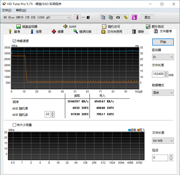 缓存部分测试通过HD Tune Pro进行测试,由于在CDM 32G数据量测试中出现了明显的顺序写入成绩下降,所以通过HD tune Pro写入100G数据,最终WD Blue SN570的SLC Cache容量为10G左右,缓外写入稳定在580MB/S~700MB/S之间,10G的SLC Cache容量偏小,不过基本上也够用了。