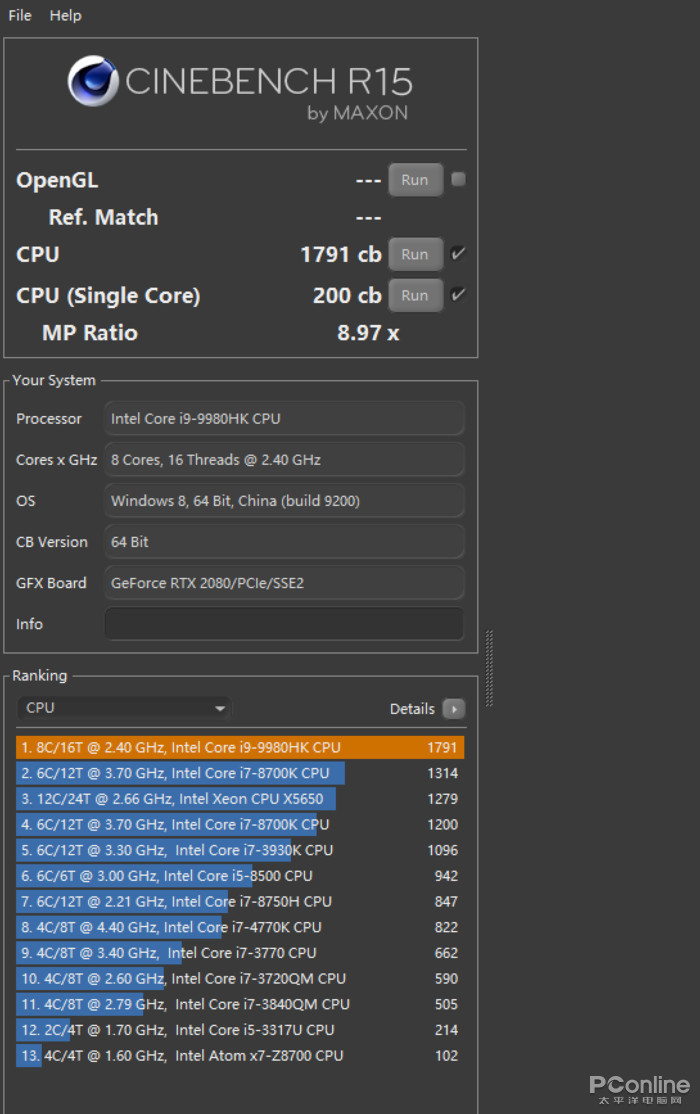↑i9-9980HK,CBR15多核:1791cb,单核200cb。