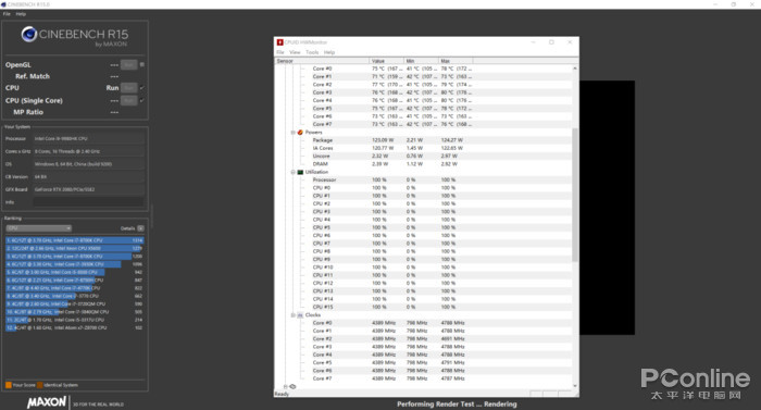 在测试CPU多核渲染性能的Cinebench R15多核测试中,i9-9980HK最高功耗达到了123W(TDP设定为45W),全核睿频可提升至4.4GHz,而单核睿频更是达到了4.7GHz,即便是放在桌面级领域,同样也是非常高的频率范围,相当惊人。