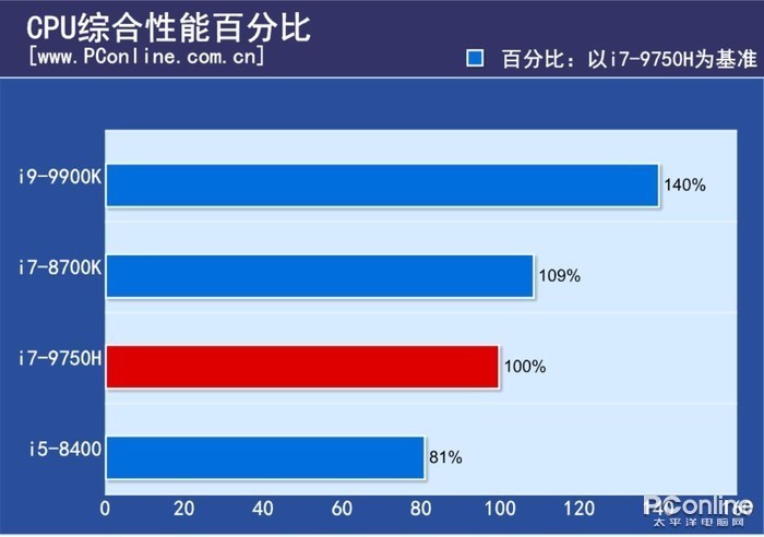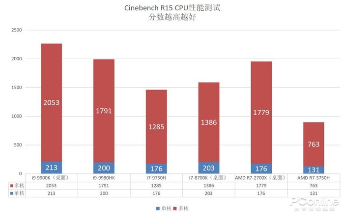 那么如果你说i9-9980HK太高级了,在大众玩家心中不具有很强的代表性,那么主流高端级别的i7-9750H就比较有话语权了。Cinebench R15的结果表明,i7-9750H仅次于i7-8700K、Ryzen 7 2700X高端桌面处理器,并且i7-9750H也已经完成了对大多数人使用的主流型号i5-8400桌面级处理器的性能超越,领先幅度达到23%左右。