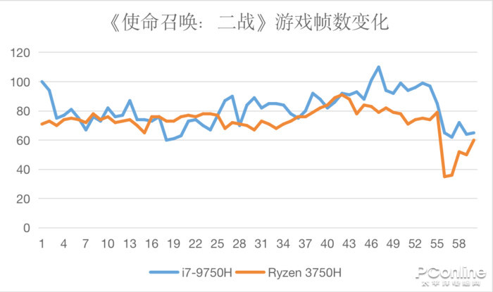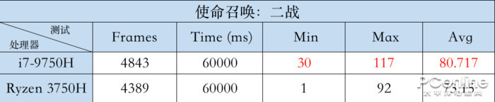 《使命召唤:二战》,英特尔版帧数表现整体就比AMD版要好一些,而在多达连续4000多帧的测试里,最低帧数、最高帧数、平均帧数都要更高。