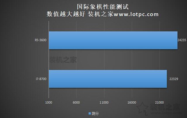 国际象棋测试中,i7-8700分数为22329分,R5-3600分数为24235分,综合性能领先了7.8%,主要是多线程的优势。