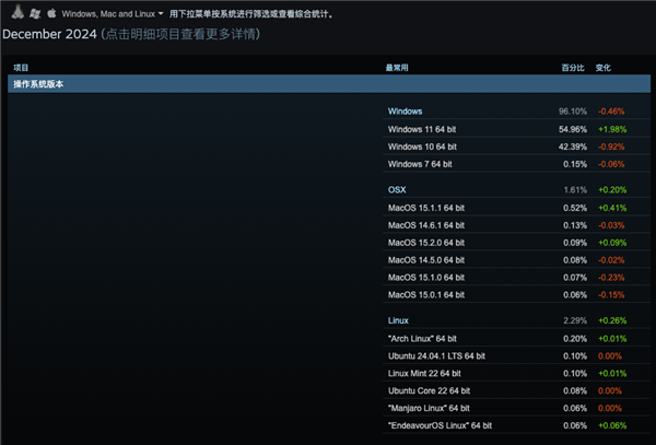 敢情在 Mac 上普及游戏,最大的门槛是苹果那金子一样贵的硬盘?即使买外置硬盘存储游戏,也意味着在 Mac 上玩游戏,你还是要单独再掏一笔钱。那合着 Mac 用户们,打个游戏还是挺不直腰杆。。。调侃归调侃,托尼查了下 Steam 平台在 2024 年 12 月的客户端数据,发现MacOs ( 1.61% )的游戏市场份额,竟然还比不上 Linux ( 2.29% )。