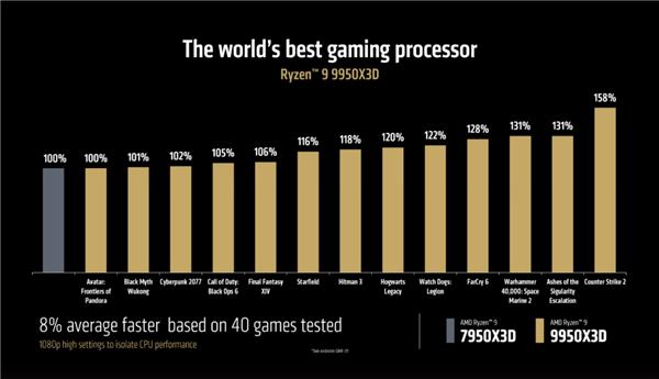 性能方面,官方宣称在40款游戏中,锐龙9 9950X3D相比于前代锐龙9 7950X3D平均提升8%,《CS2》最好可达58%,《Fry Cry 6》《战锤4K:星际战士2》、《奇点灰烬:扩展版》等都在30%左右。