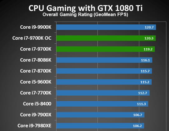 从这个图中可以看出,酷睿i7-9700K的游戏性能也是顶级水平的,能比它更好的就是酷睿i9-9900K处理器了。
