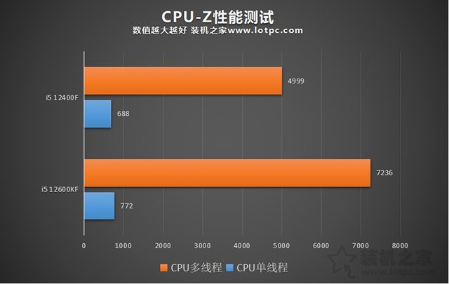 在CPU-Z基准测试中,i5 12600KF在单核性能上相比i5 12400F强了12%左右,由于加上i5 12600K加入了4个效能核,所以多线程优势很明显,相比i5 12400F强了40%左右。