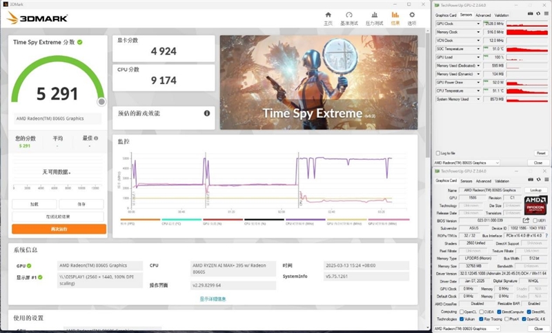 在4K分辨率3DMark Time Spy Extreme测试中,RADEON 8060S图形分数为4924分,核心温度最高91℃,核心运行最高频率为2528MHz,显卡最大功耗92W。