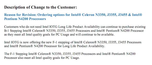 不过很快,Intel就撤除了通知,并在今天上线更新版本,去除了对产品缺陷的描述,强调现有B1步进版本的奔腾N4200、赛扬N3350/J3355/J3455仍然满足PC使用质量标准,不会停产退市,Intel CCG(客户端事业部)将继续供货。